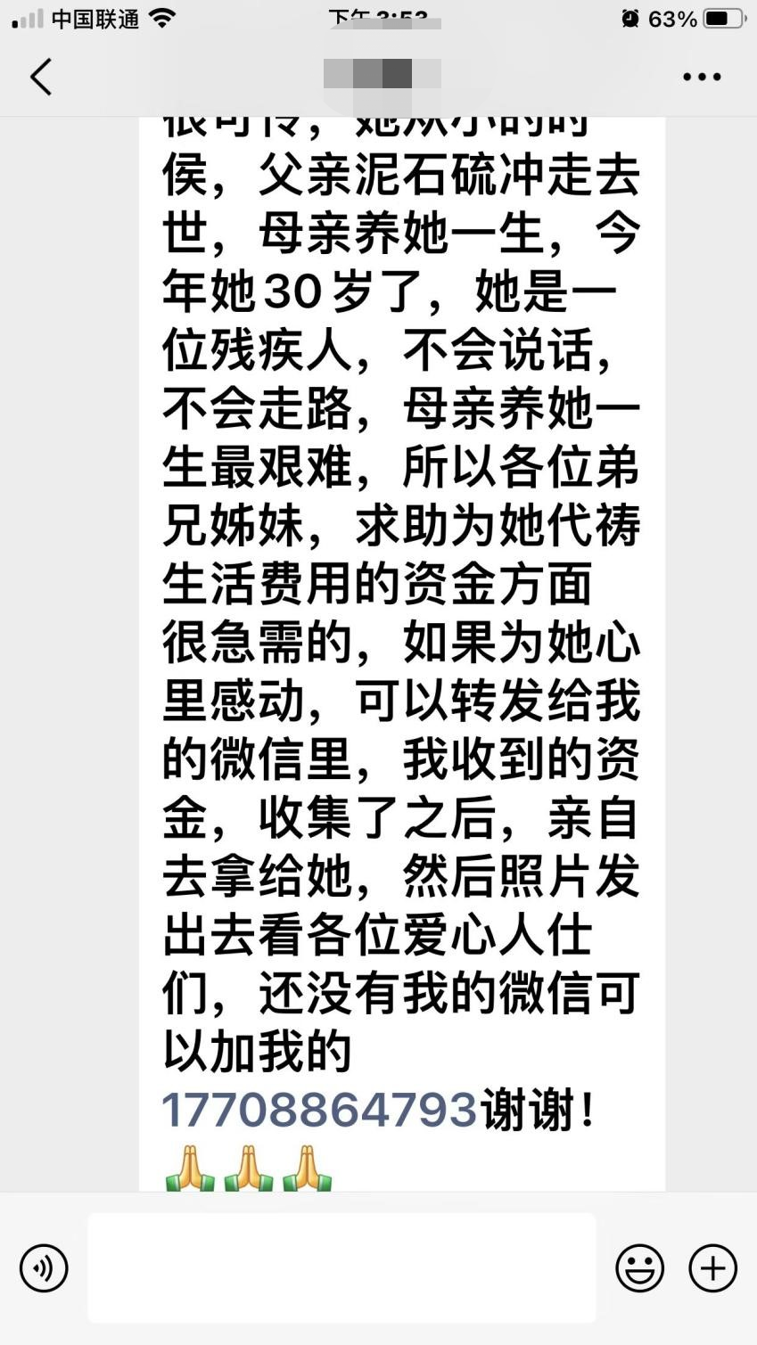 而今晨,一位主内姊妹发给我一封求助信,讲一位残疾人,父亲被泥石流冲走;母亲年龄大了,自己还是个哑巴,需要资金援助。并留下求助者的手机微信,称收到资金后亲自拿给她。但没有说明这个收款人是谁,与求助者什么关系,明明就是个骗局,但老姊妹出于爱心,仍是热心地在微信里转发给主内家人……