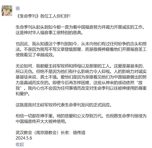 2024年5月6日,骆毅祥传道在微信中发出了对王峙军牧师信件的回复: