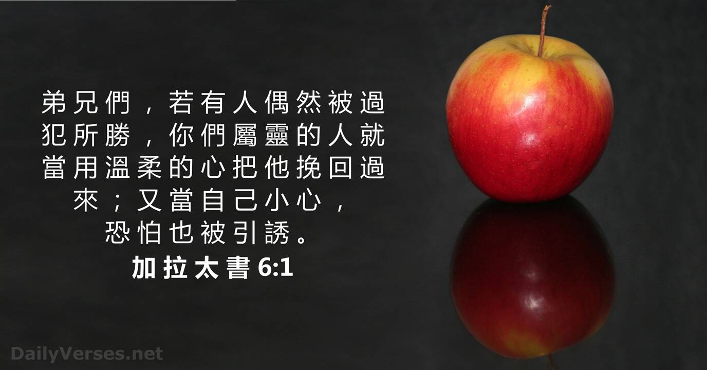 弟兄们,若有人偶然被过犯所胜,你们属灵的人就当用温柔的心把他挽回过来;又当自己小心,恐怕也被引诱。(加6:1)